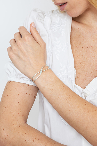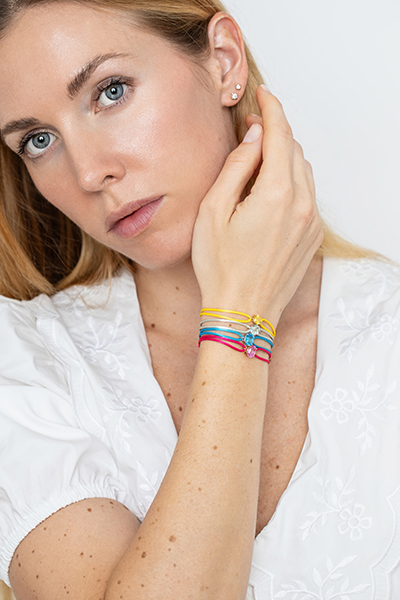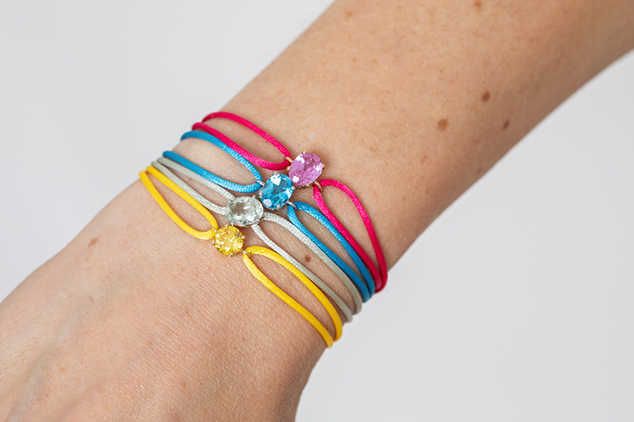 Bracciale in tessuto nautico intrecciato con oro 18 K e pietra topazio in vari colori e tipologie. Il bracciale di tendenza nell’estate 2025 che esalterà le braccia e l’outfit con stile.